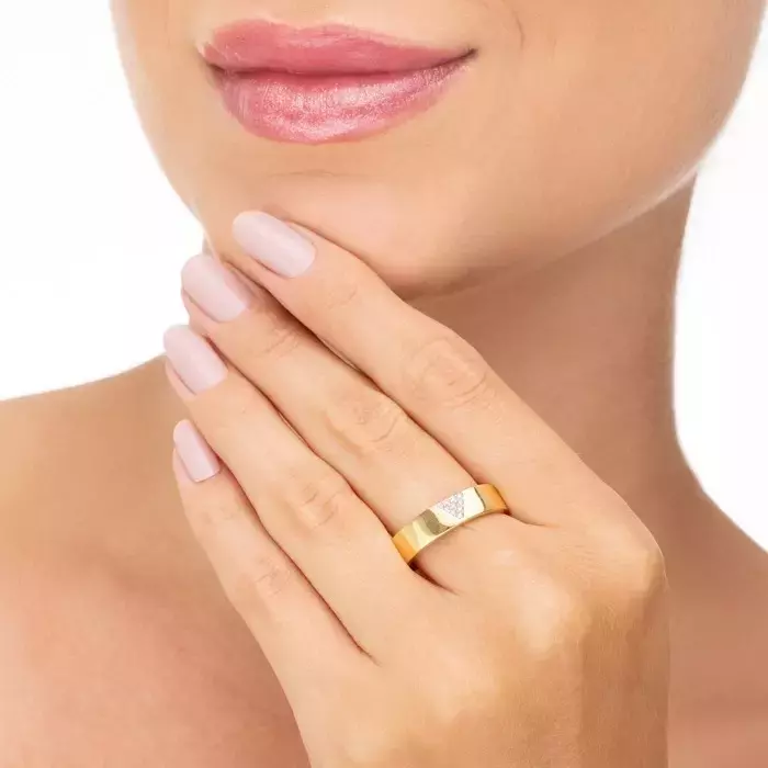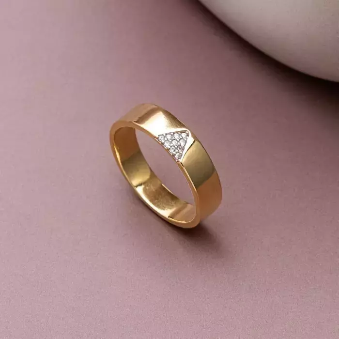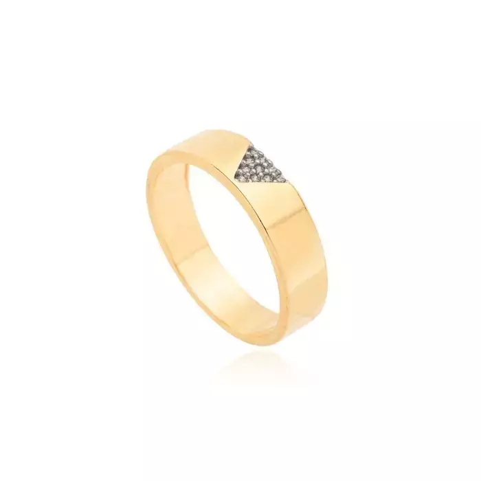 Anel com banho de ouro 18K, de aro liso e elegante, com detalhe geométrico em forma de triângulo microcravejado de zircônias brancas. O contraste entre o dourado intenso e o brilho cristalino das pedras cria uma peça sofisticada e atemporal. Seu design minimalista une delicadeza e força, perfeito para pessoas que buscam semijoias versáteis e marcantes.