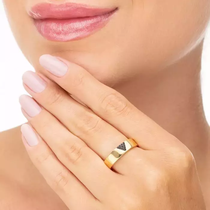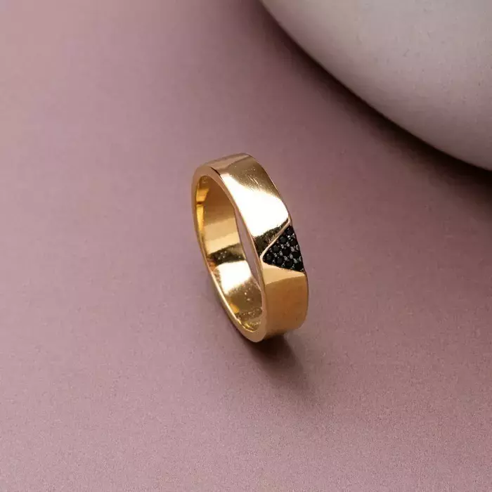 Anel com banho de ouro 18K, de aro liso e moderno, com detalhe geométrico em forma de triângulo microcravejado de negras. O contraste entre o dourado intenso e o brilho marcante das pedras escuras cria uma peça elegante e contemporânea. Seu design minimalista transmite estilo e personalidade, ideal para pessoas que buscam semijoias sofisticadas e cheias de significado.