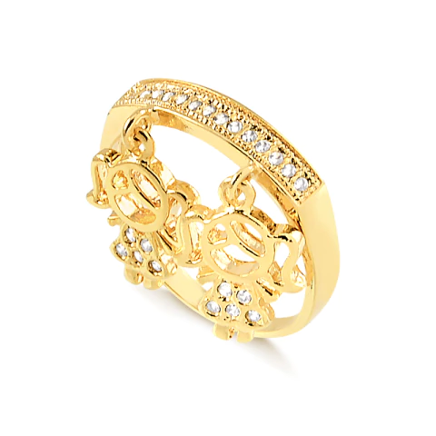 Anel com banho de ouro 18K, de aro dourado com microzircônias brancas no meio, trazendo como destaque dois pingentes de meninas estilizadas com detalhes brilhantes. Uma joia delicada e cheia de movimento, que simboliza o amor e o carinho por pessoas queridas.