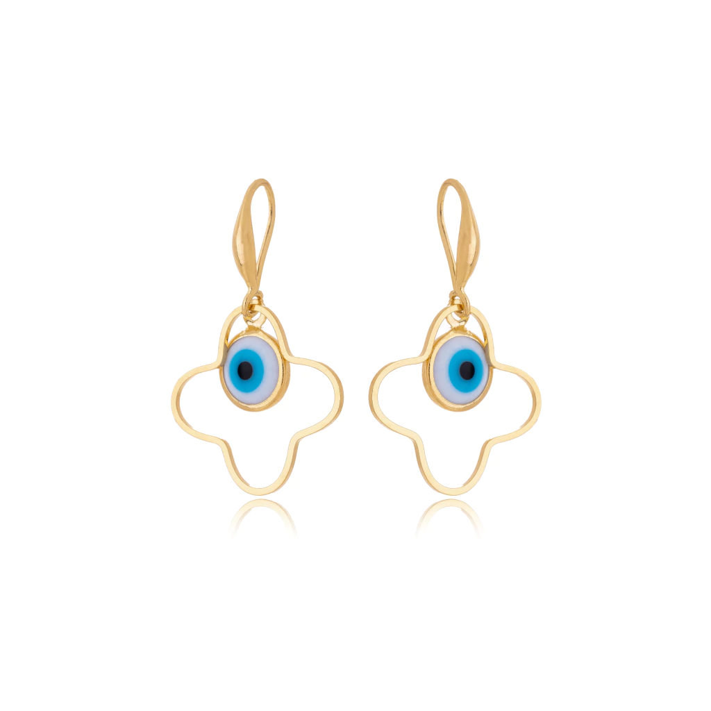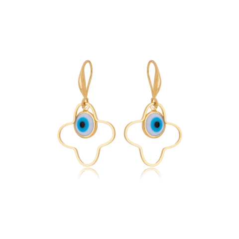 Brinco Flor De Olho Grego é uma semijoia com banho de ouro 18K, este delicado brinco combina o formato de flor vazada com o tradicional olho grego azul, símbolo de proteção e boas energias. Seu design leve e moderno traz um toque de elegância e espiritualidade ao visual, perfeito para quem deseja se destacar com sutileza e significado.